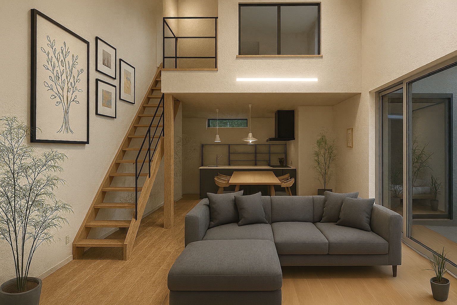 吹き抜けと中庭があることで視線が縦にも横にも広がる開放的なLDK。余白となる壁には絵画を飾ることでシンプルながらも上質な空間づくりになっていきます。