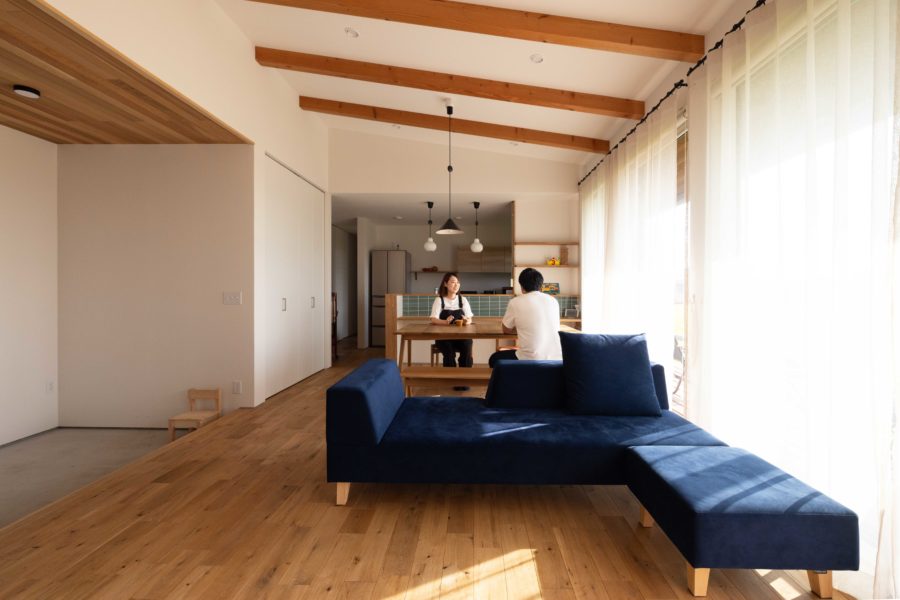 2階建てと平屋建てを緩やかに繋ぐ二世帯住宅。大きな吹き抜けで繋がる開放的なLDKからは、土間に設置した薪ストーブの炎をいつでも眺めることができます。洗面台や洗濯物スペースを廊下となる部分に計画し、極端に世帯を分けずに緩やかに繋ぐことで、家族とのコミュニケーションも取りやすくなりました。