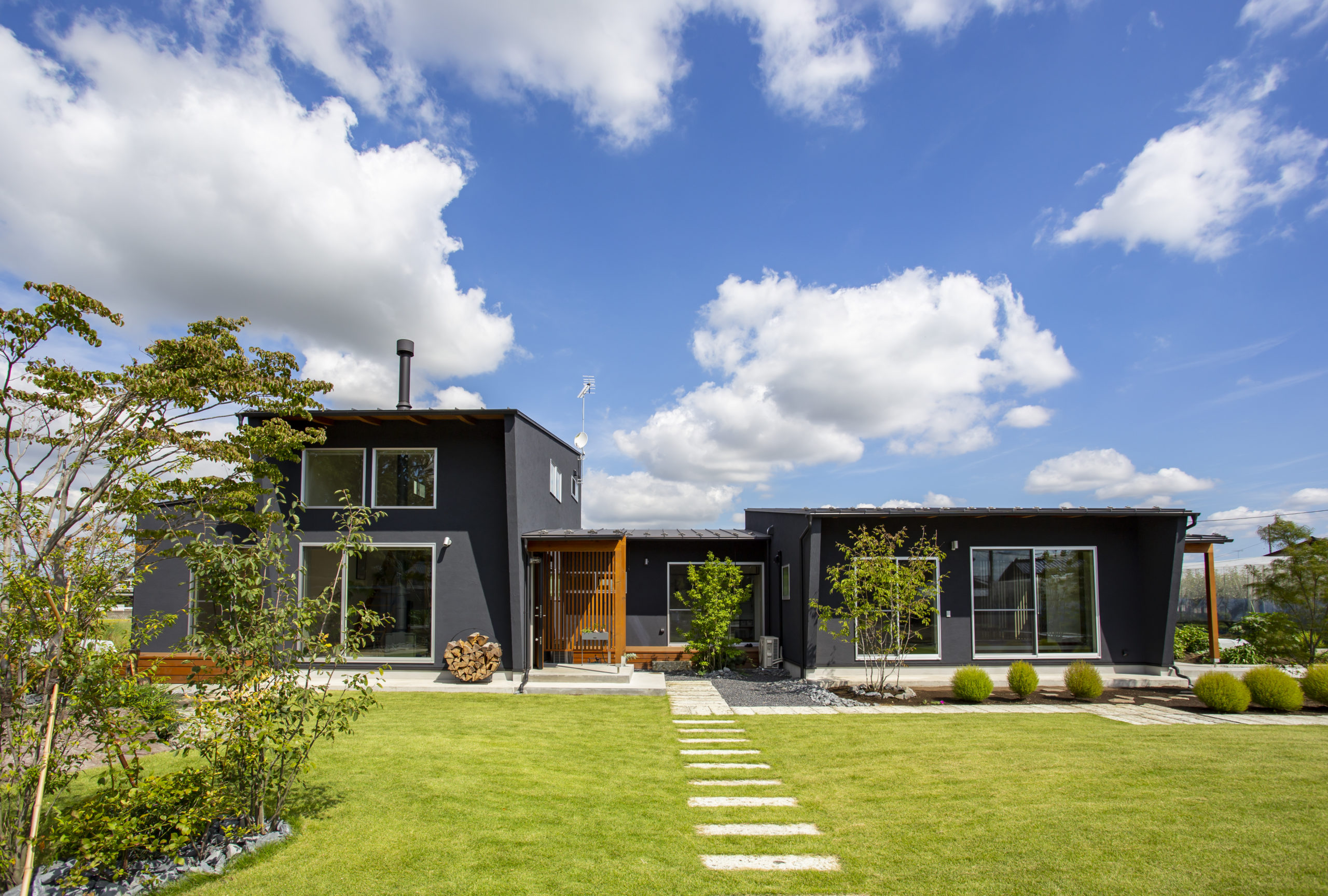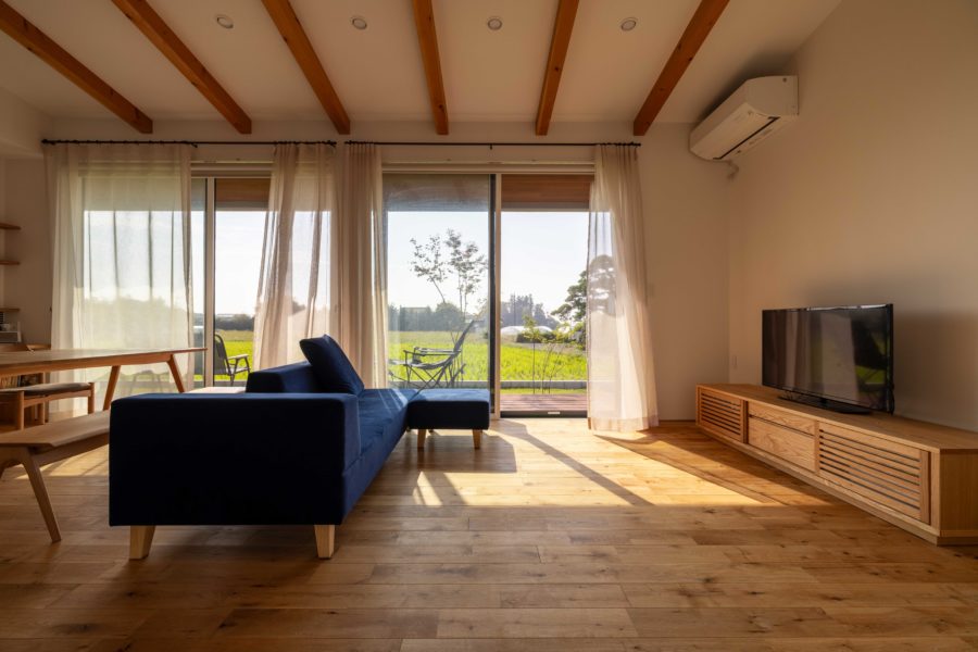 温もりのある塗り壁とウッドデッキが周辺の風景にしっくりと馴染む外観。南面に広がる田園風景を眺められるよう、大きな窓を採用しました。家の中にいながら緑を愉しむことの出来る、心も体も豊かに暮らせる平屋です。