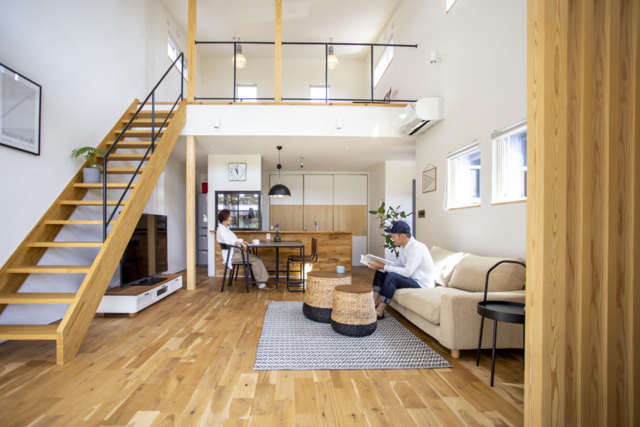 切妻屋根が特徴的な外観は、永く住んでも飽きのこないシンプルなデザイン。建物の中心にリビングを配置することで家事の行き来がスムーズになるような動線計画と、オーク材で設えた床の質感や塗り壁の空気感の良さ。ゆったりと時間が流れる、スローライフな日々を楽しめるお家です。
