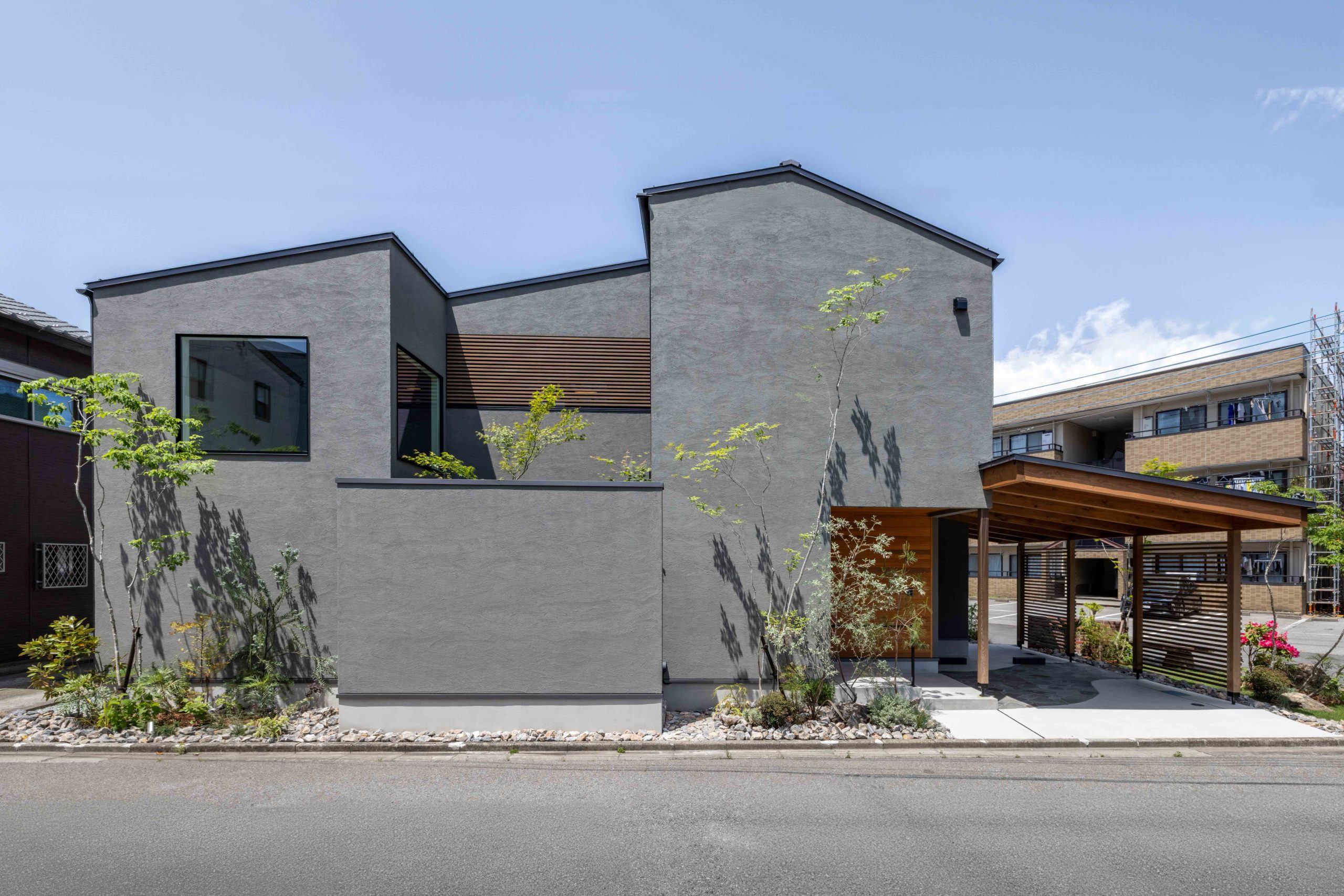 グレーの塗壁外壁とレッドシダーのコントラストが美しい外観デザイン。道路側からは見えない中庭があることで暮らしに豊かにしてくれます。